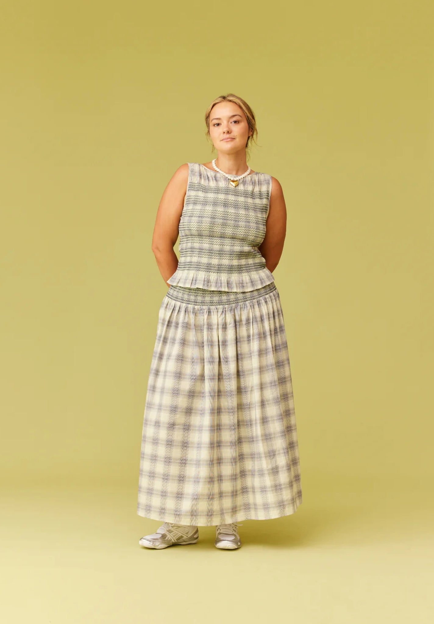 Sleeveless, fitted top with smocking throughout the body to create texture and shape. Features a soft ruffle at the hem, which compliments the smocking detail.