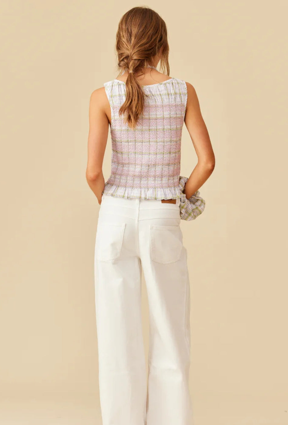Sleeveless, fitted top with smocking throughout the body to create texture and shape. Features a soft ruffle at the hem, which compliments the smocking detail.