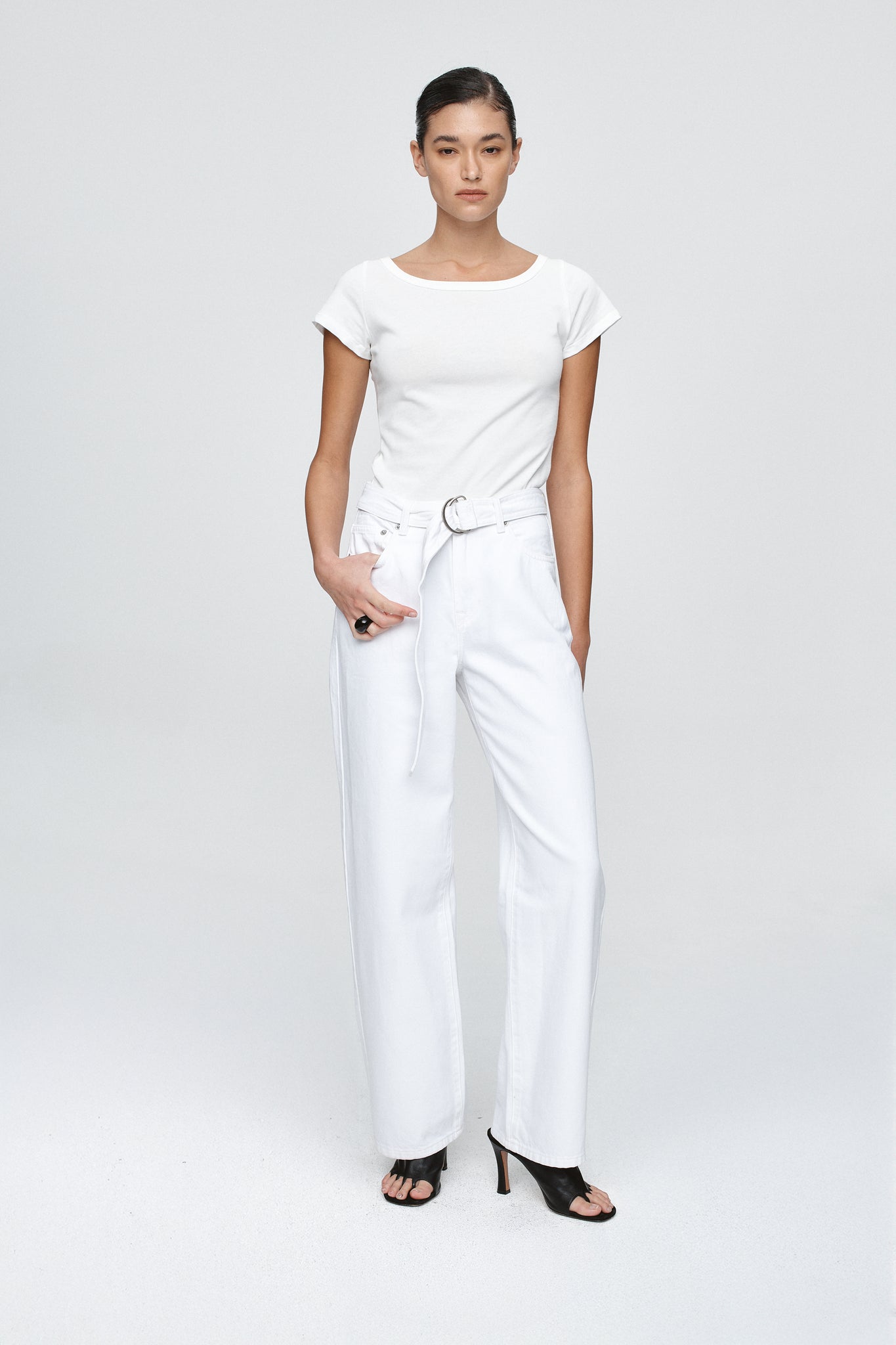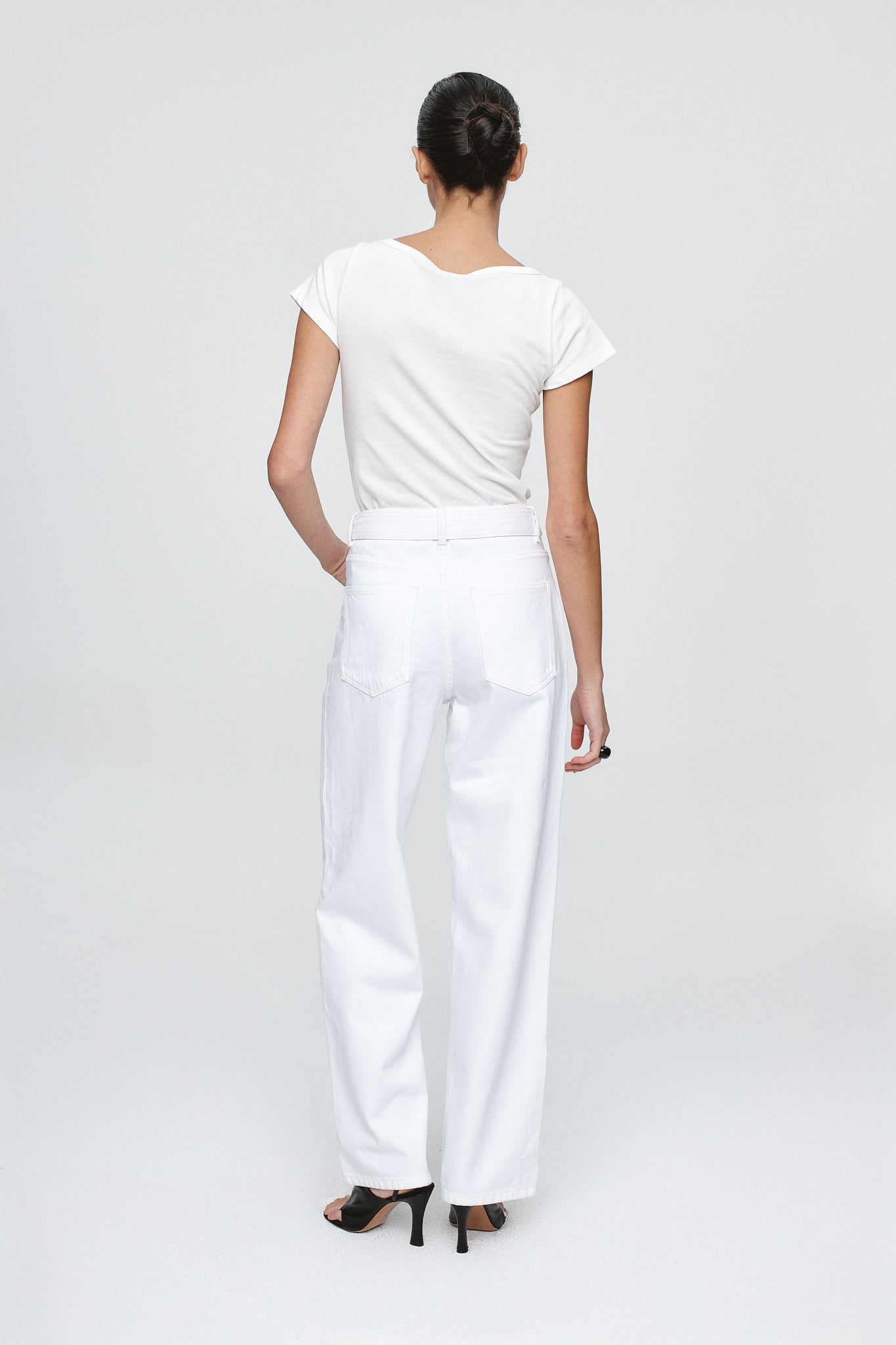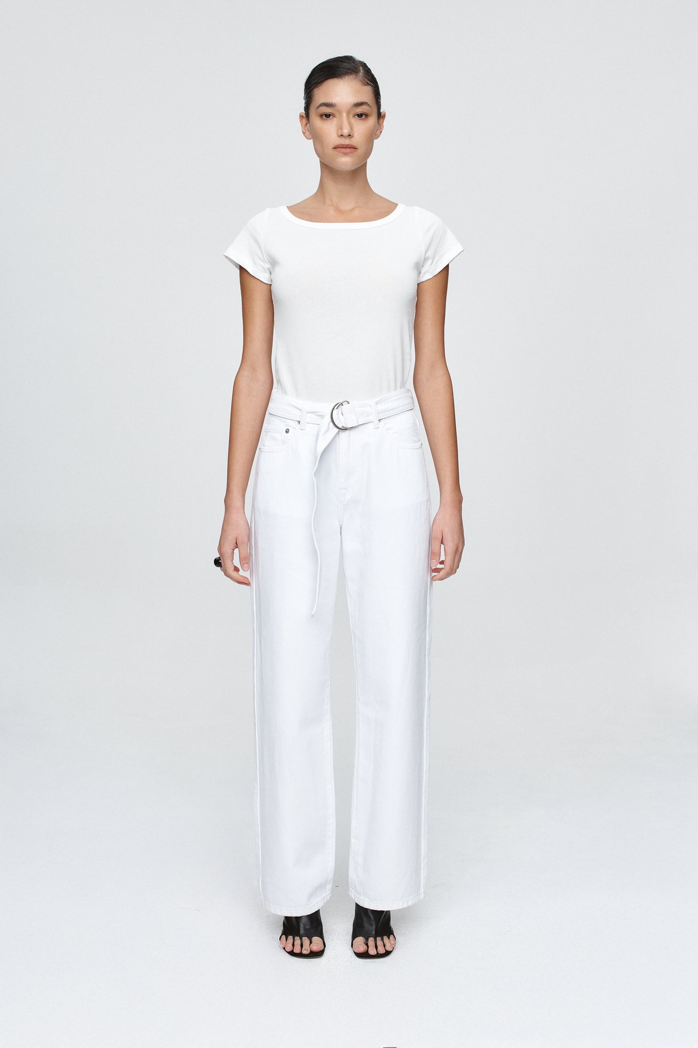 A iteration of the wide-leg jean cut in 100% organic cotton. Sitting neatly at the waist and hips. Designed with a self-fabric belt with metal D-ring hardware, allowing for subtle adjustability at the waist. Finished with a mid-rise waistband, zip and fly closure and classic five-pocket construction. Finished with topstitching to reinforce all seams for durability.