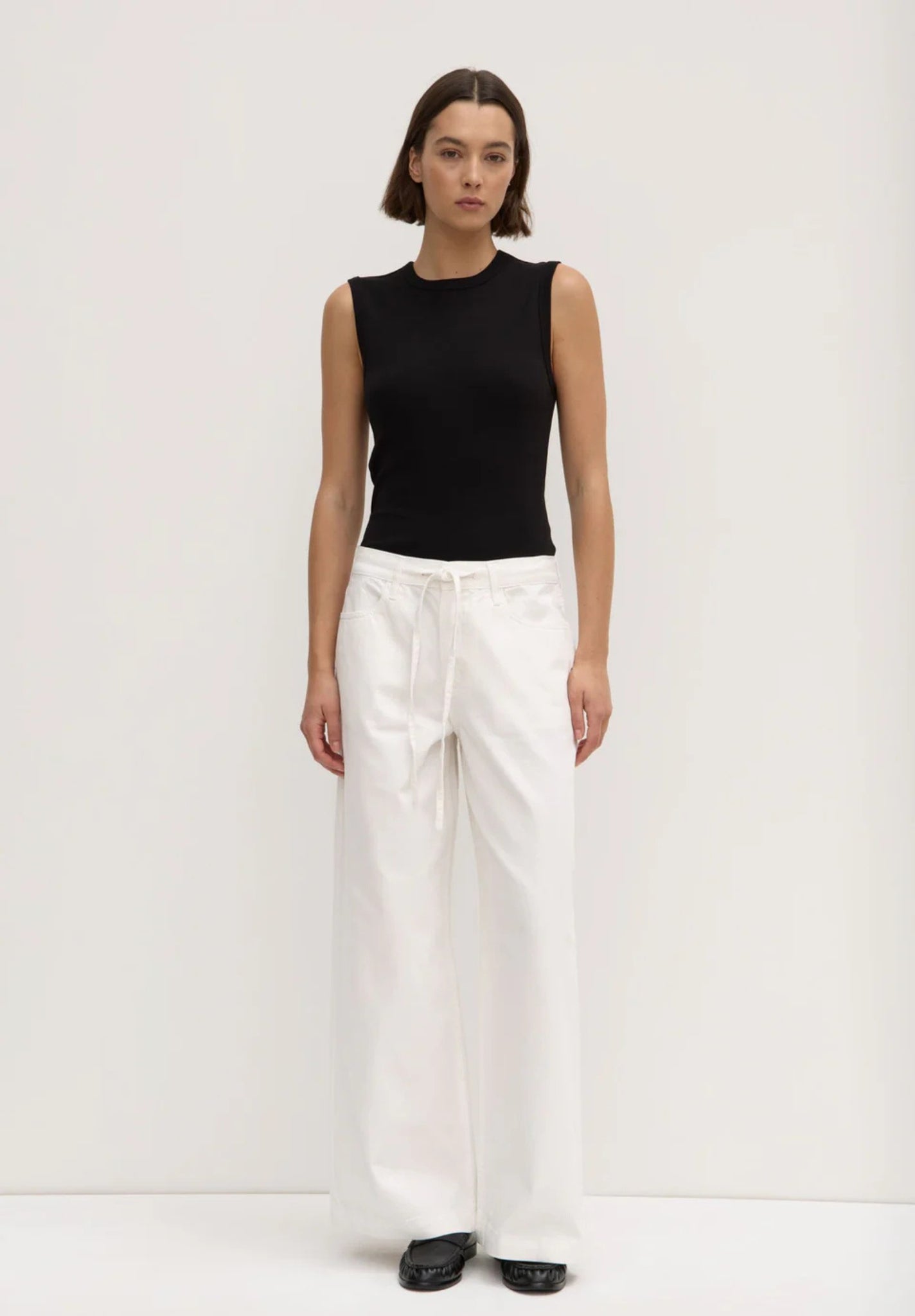 The Bobbie Twill Midrise Pant in vintage white is a textured 100% cotton twill pant with a mid-rise fit, relaxed leg, and adjustable waist tie.