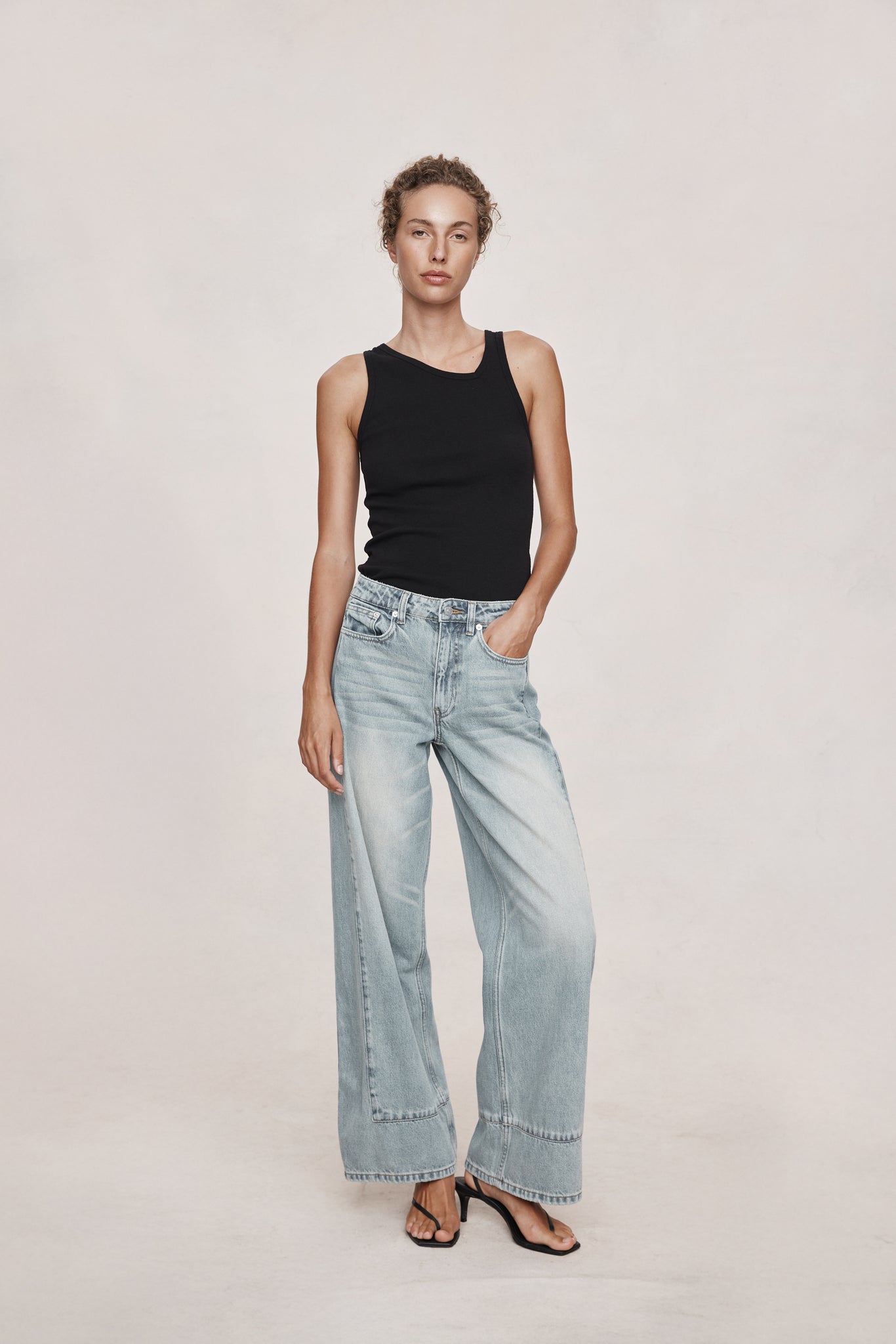 A wide-leg, full-length jean constructed from soft 100% organic cotton. Designed with a mid-rise waist and a relaxed fit through the hip and leg. Features include classic five-pocket styling, a zip fly with a button closure, and belt loops at the waistband. Finished with a contrast panel at the sides and hem for a defined border detail.