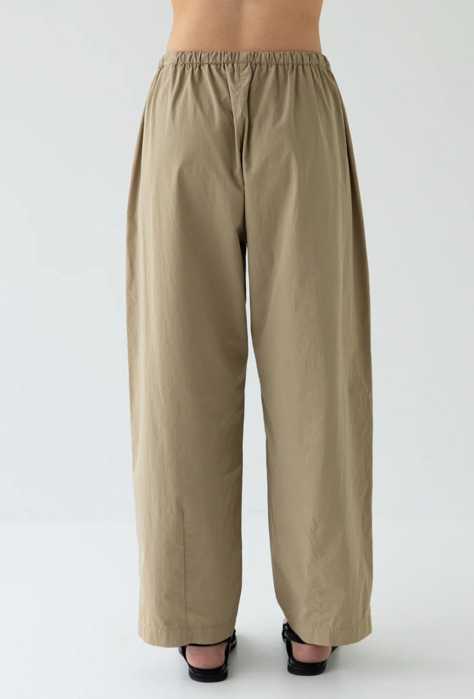 Light-weight cotton pants, elasticated waist. Darted hem for a subtle barrel leg. You will live in these.