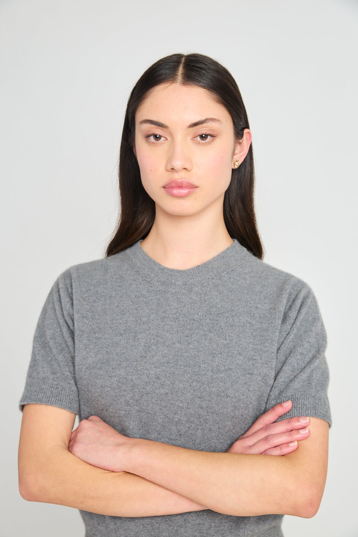The Home run tee is a soft and simple little tee, with a high, round neck. The grey marle perino is a cosy and luxurious blend of merino, possum and silk, which is spun here in Wellington and knitted in Tauranga.