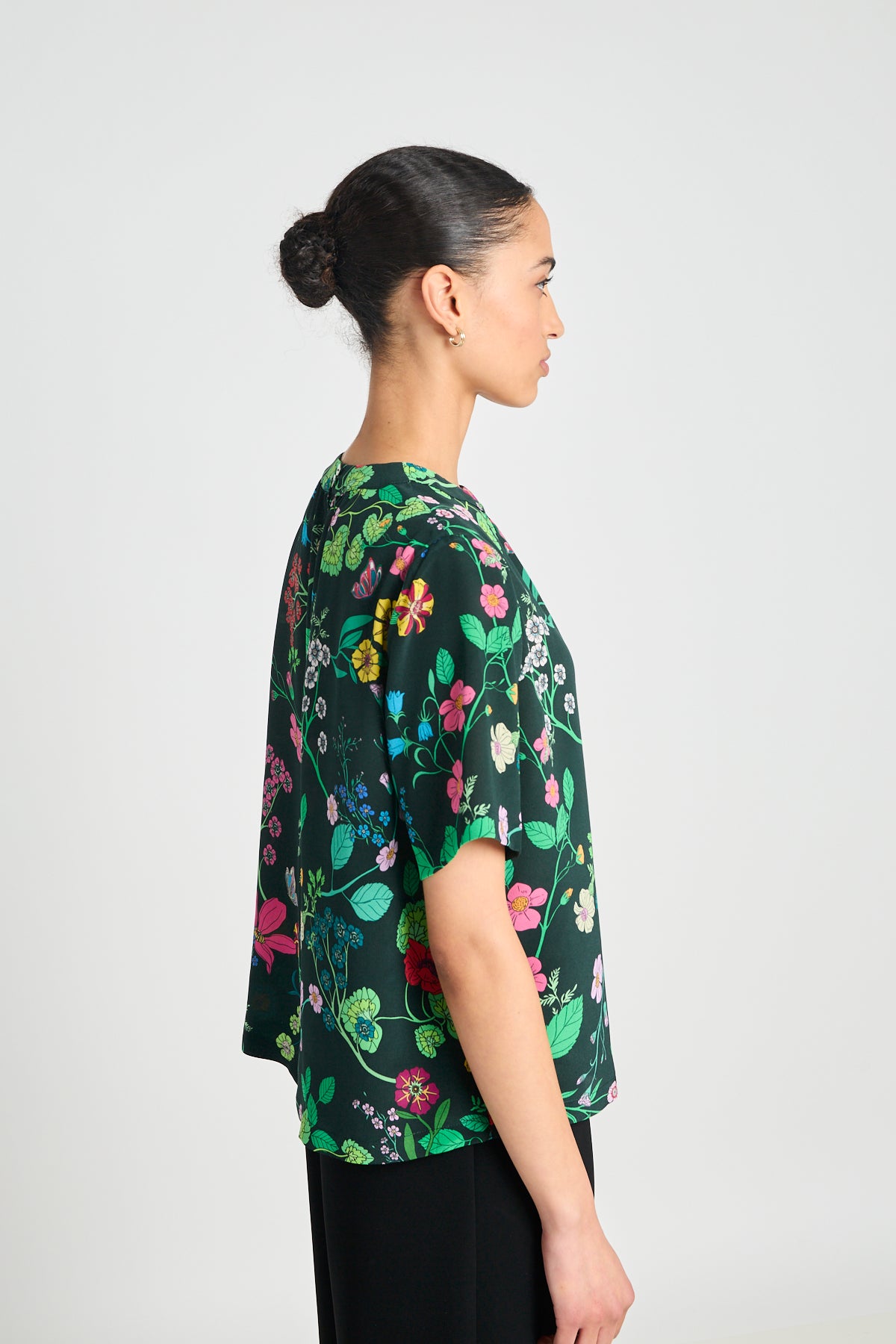 Everybody's favourite - Our classic tee cut in custom print 100% silk crepe de chine. With short sleeves, a round neck panel, and a gathered bodice at the front neck. It's time to get your flowers.
