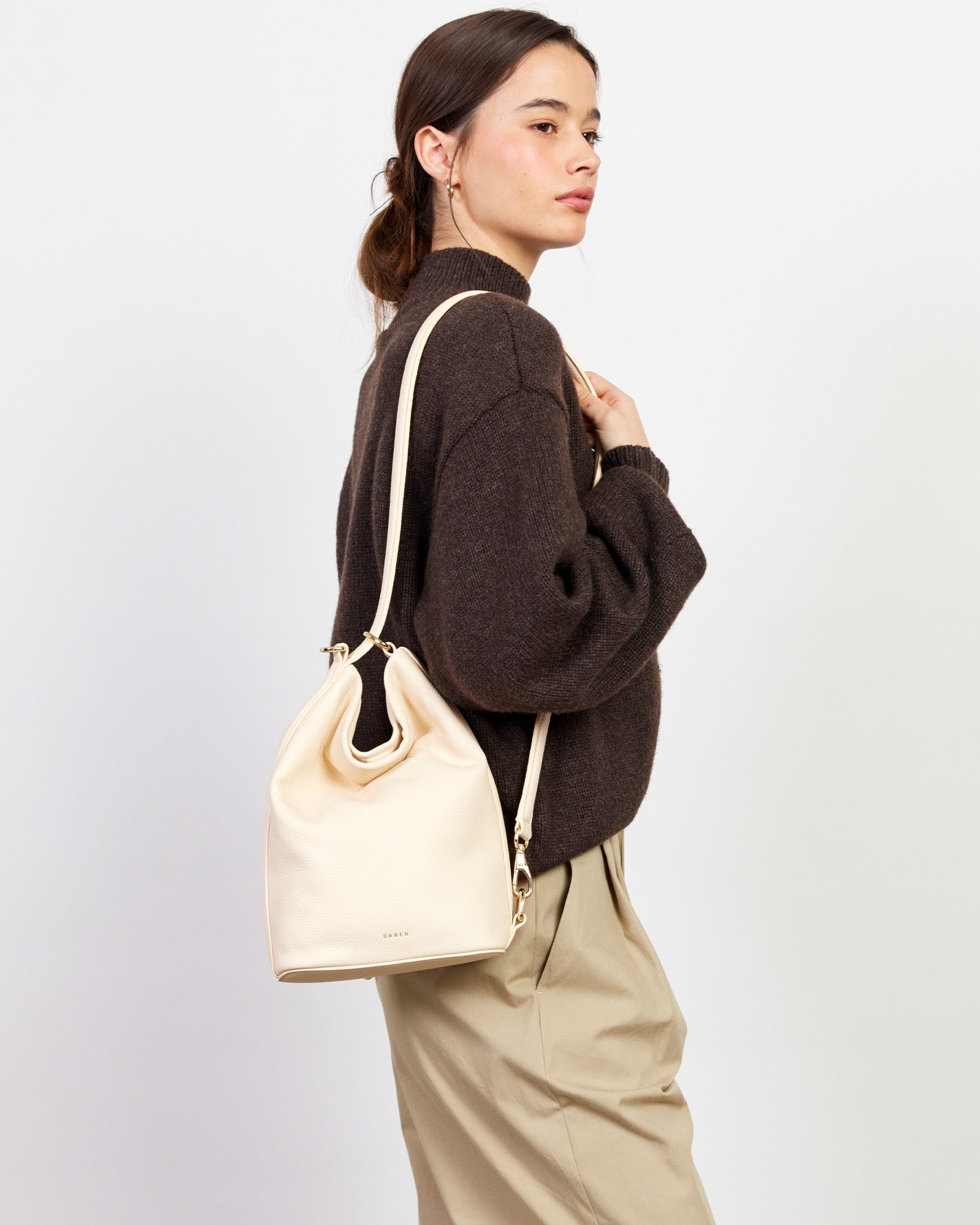 A sleek mid-sized bucket style bag; the smaller sister to our generous bucket tote June. Jojo delivers the same sophisticated functionality in a more compact form. Perfect for those who prefer to carry with intention rather than excess, while maintaining the effortless style transition from shoulder to crossbody wear. Simply unclip the signature SABEN hardware to transform it into a chic crossbody – versatility refined.