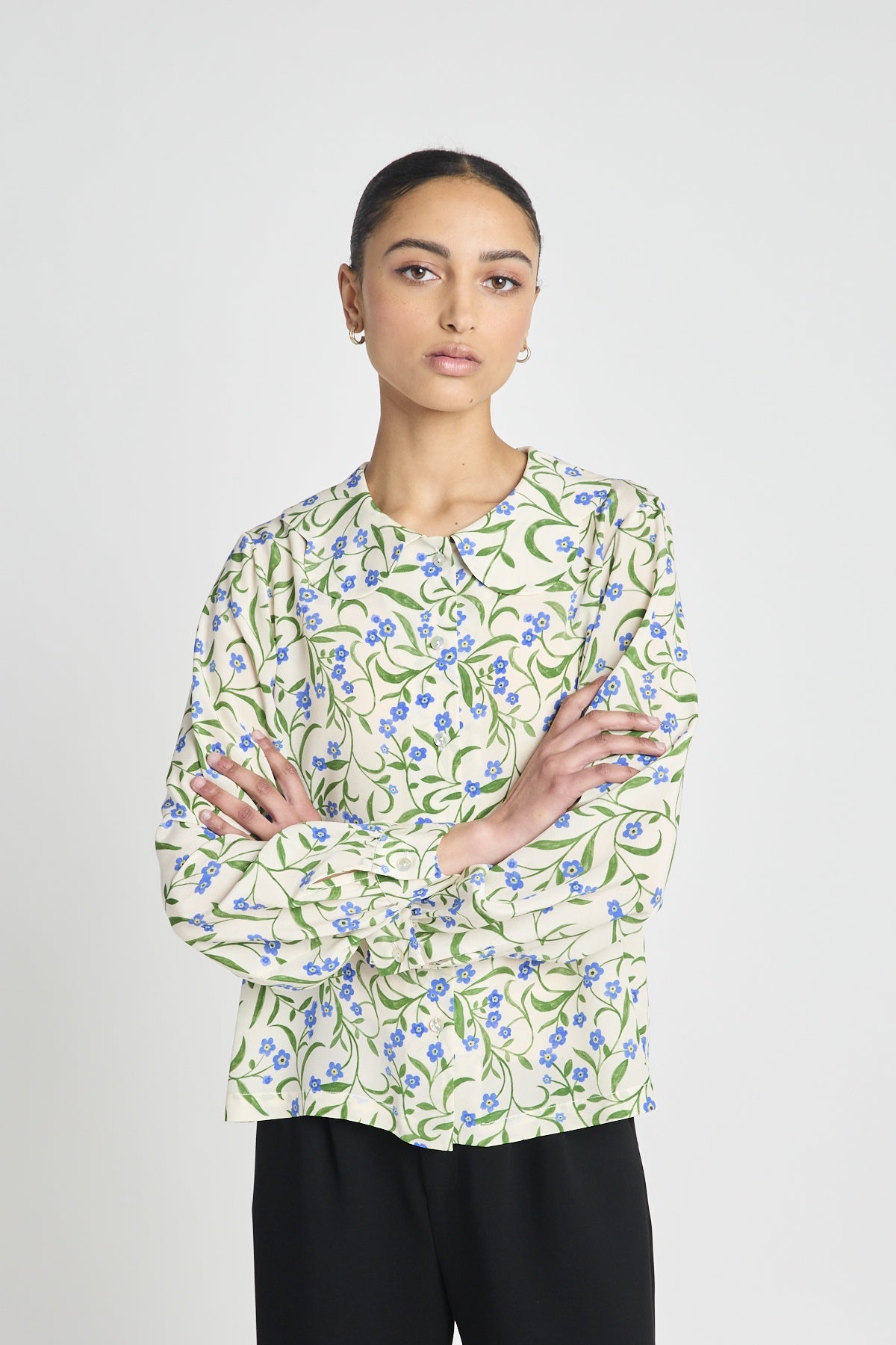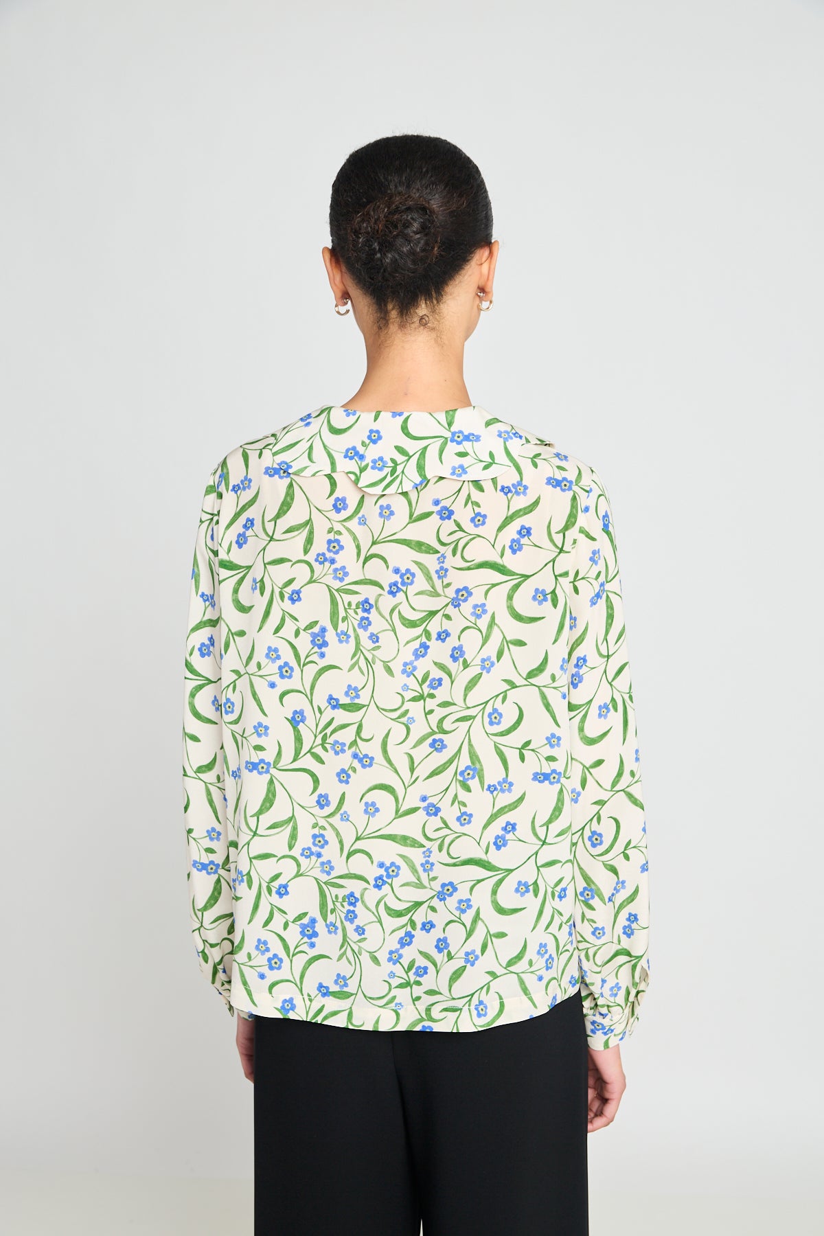 The Leela blouse is cut in decadent custom print silk crepe de chine. With long sleeves, a flat scalloped collar, gathered sleeves at cuff, and front placket.