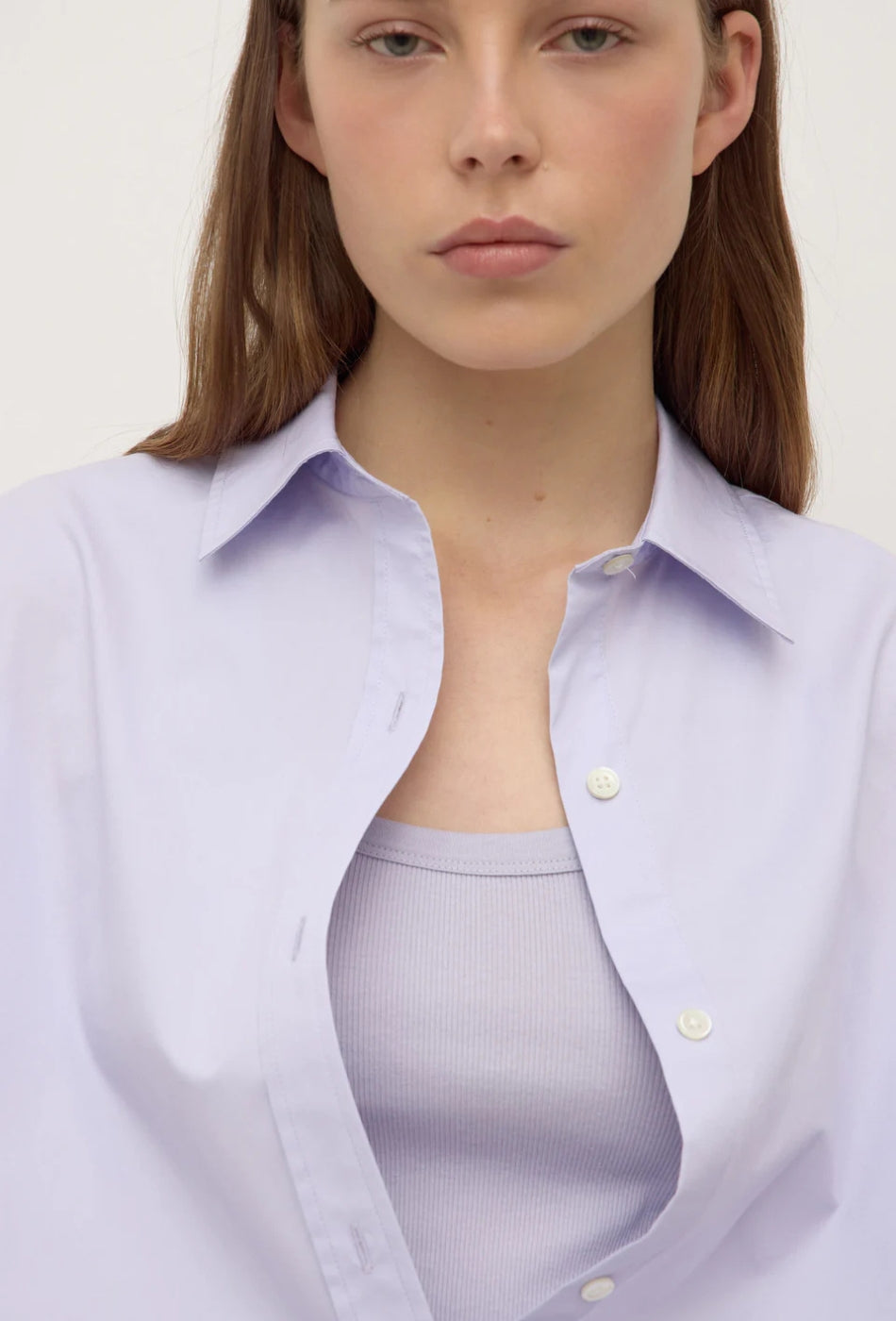 Longline cotton poplin shirt cut in a relaxed silhouette. Features a shaped hem, single-button cuffs, and a double yoke pleat detail.