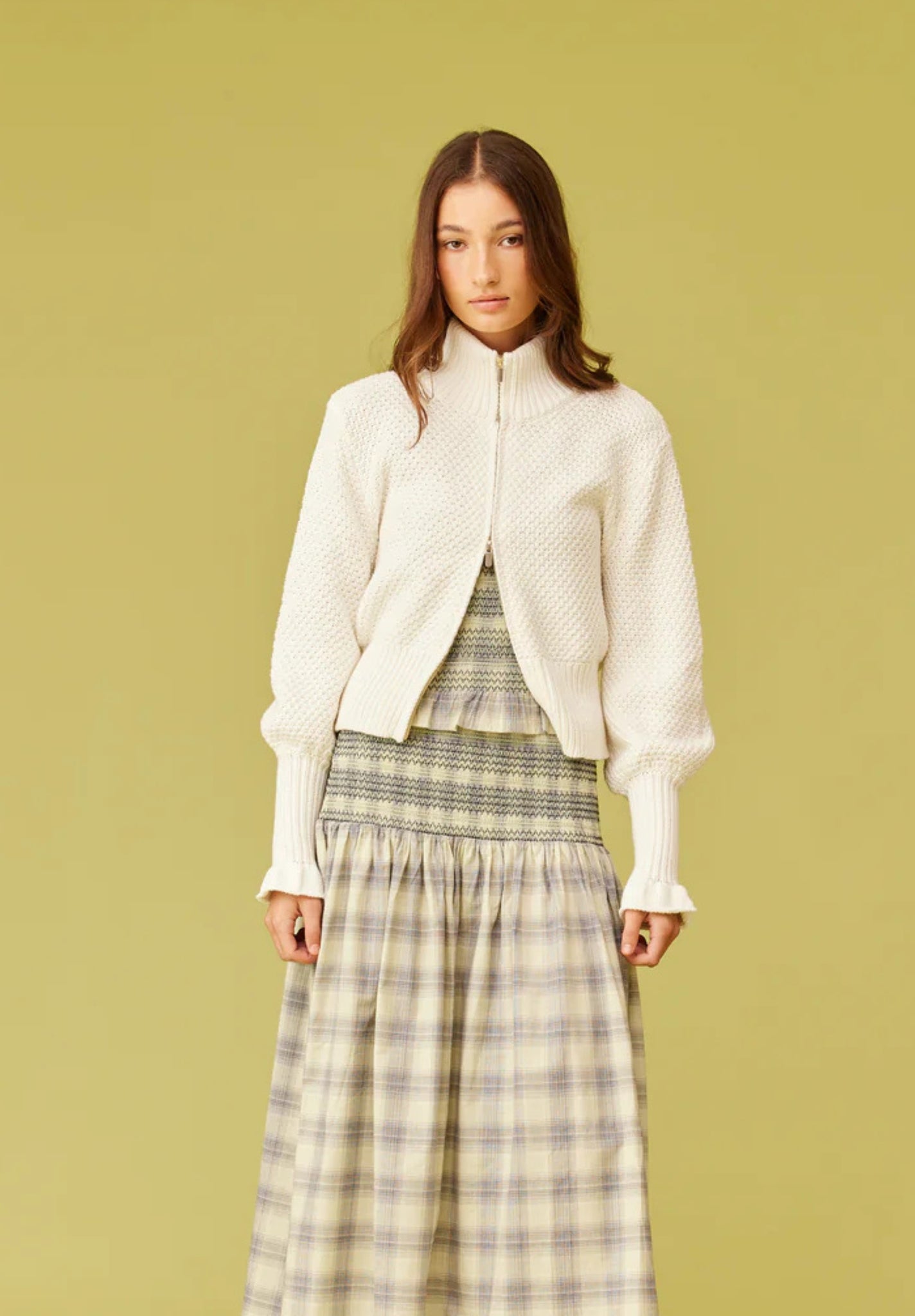 Dual-zip cardigan with a high collar and a slightly puff-shouldered silhouette. Features an exaggerated flute cuff and crafted in a chunky cotton knit.