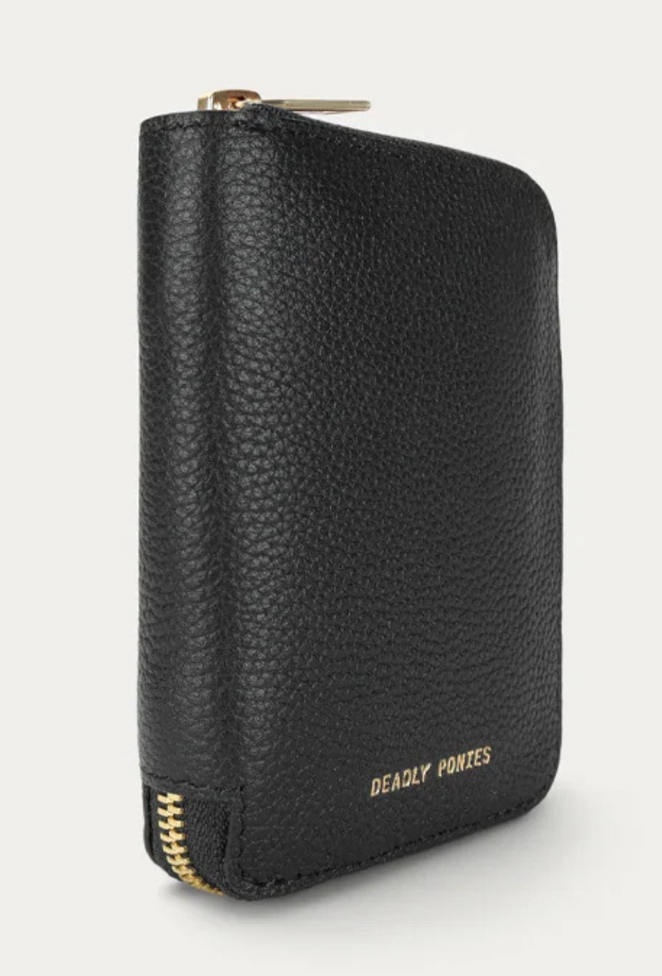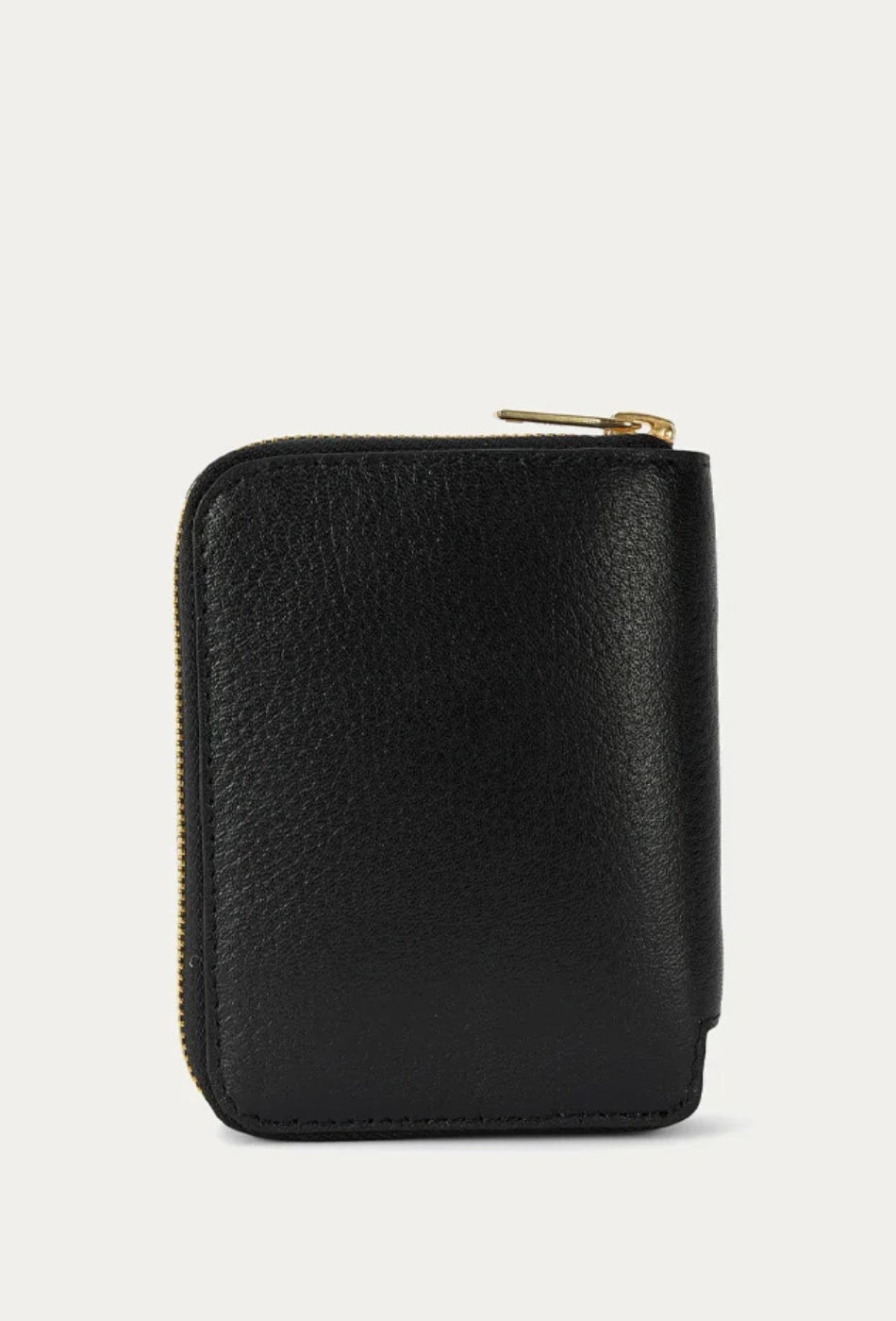 Mini Wallet in Black is crafted from textured Grained Calf Leather. Slimline yet functional, it features a brass zip closure and holds five card slots, two cash compartments, and a domed coin purse, keeping your essentials secure.