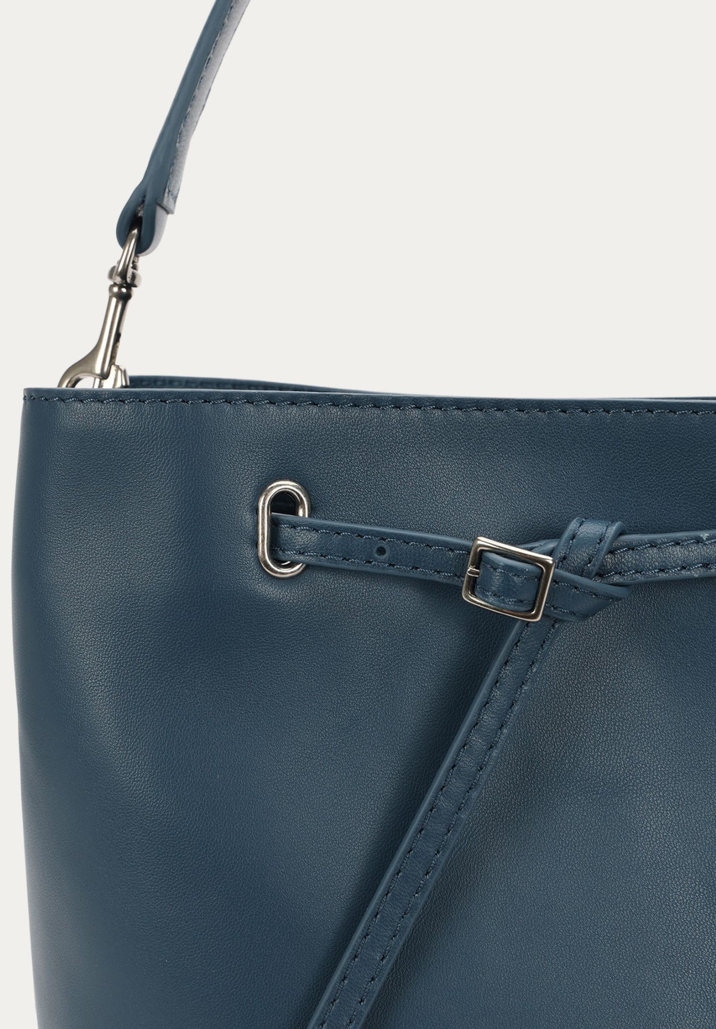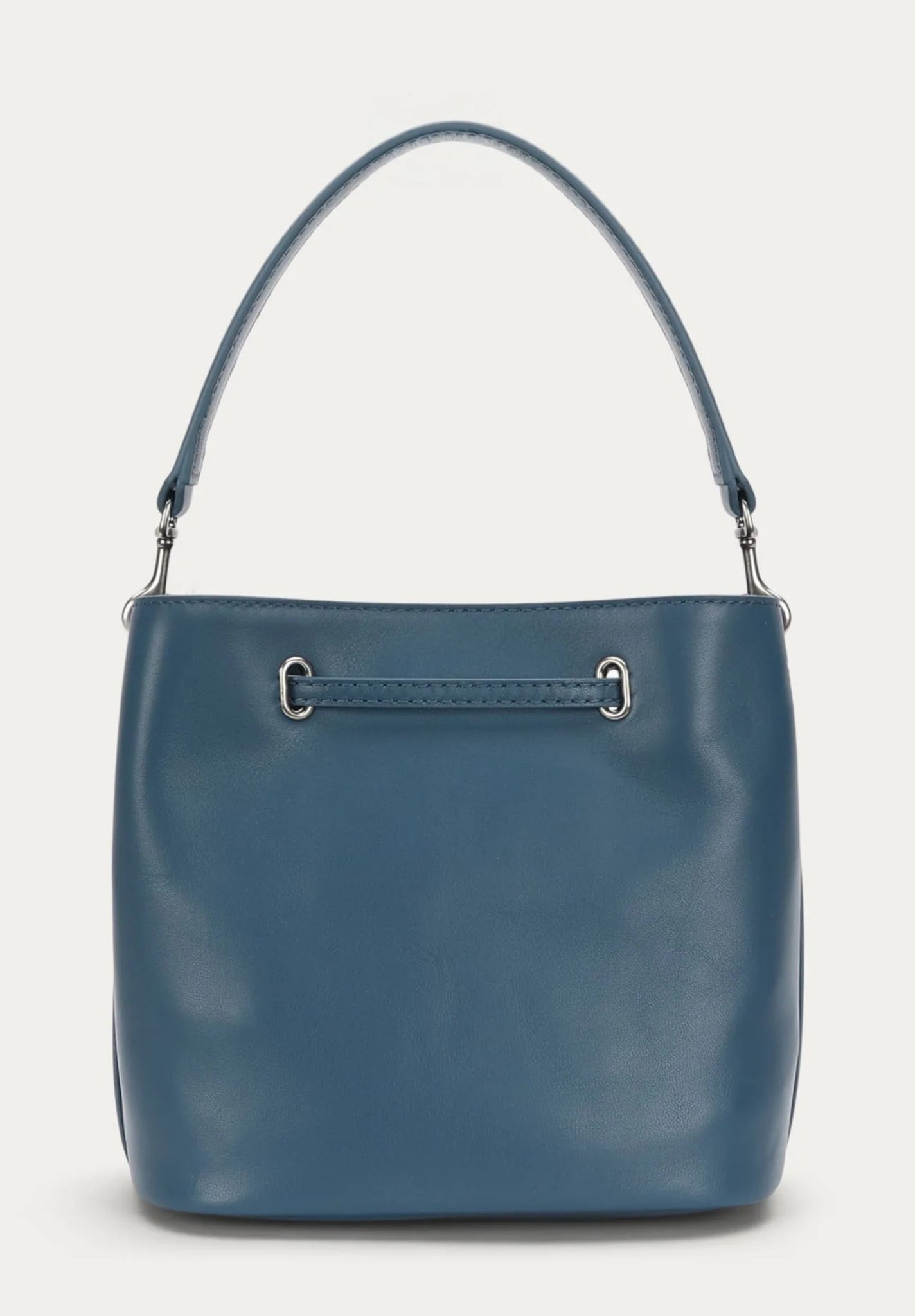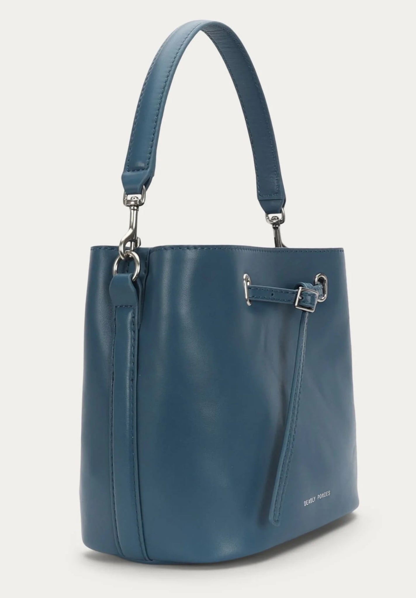 Mr Penny in Dusk reimagines the classic bucket bag in LWG-certified Lamb Nappa with silver finish brass hardware. Featuring leather detailing threaded through silver finish brass eyelets, a detachable top handle, adjustable strap, and a removable cotton pouch.