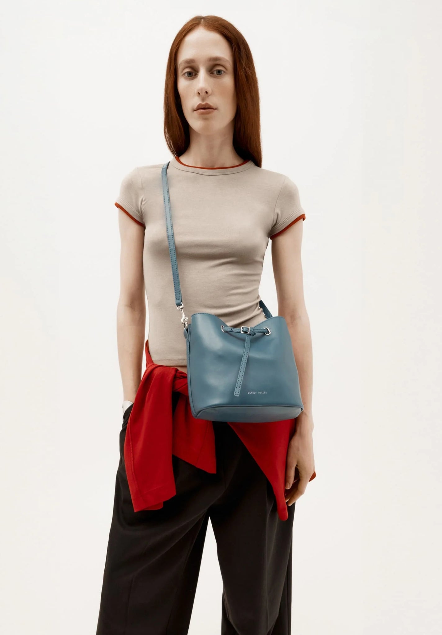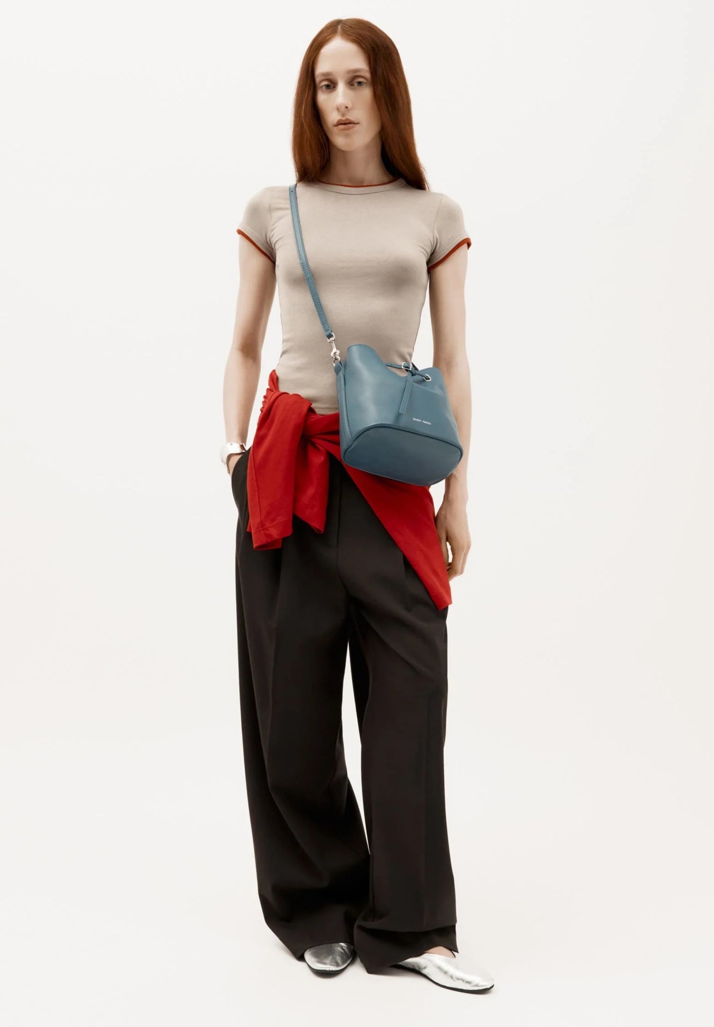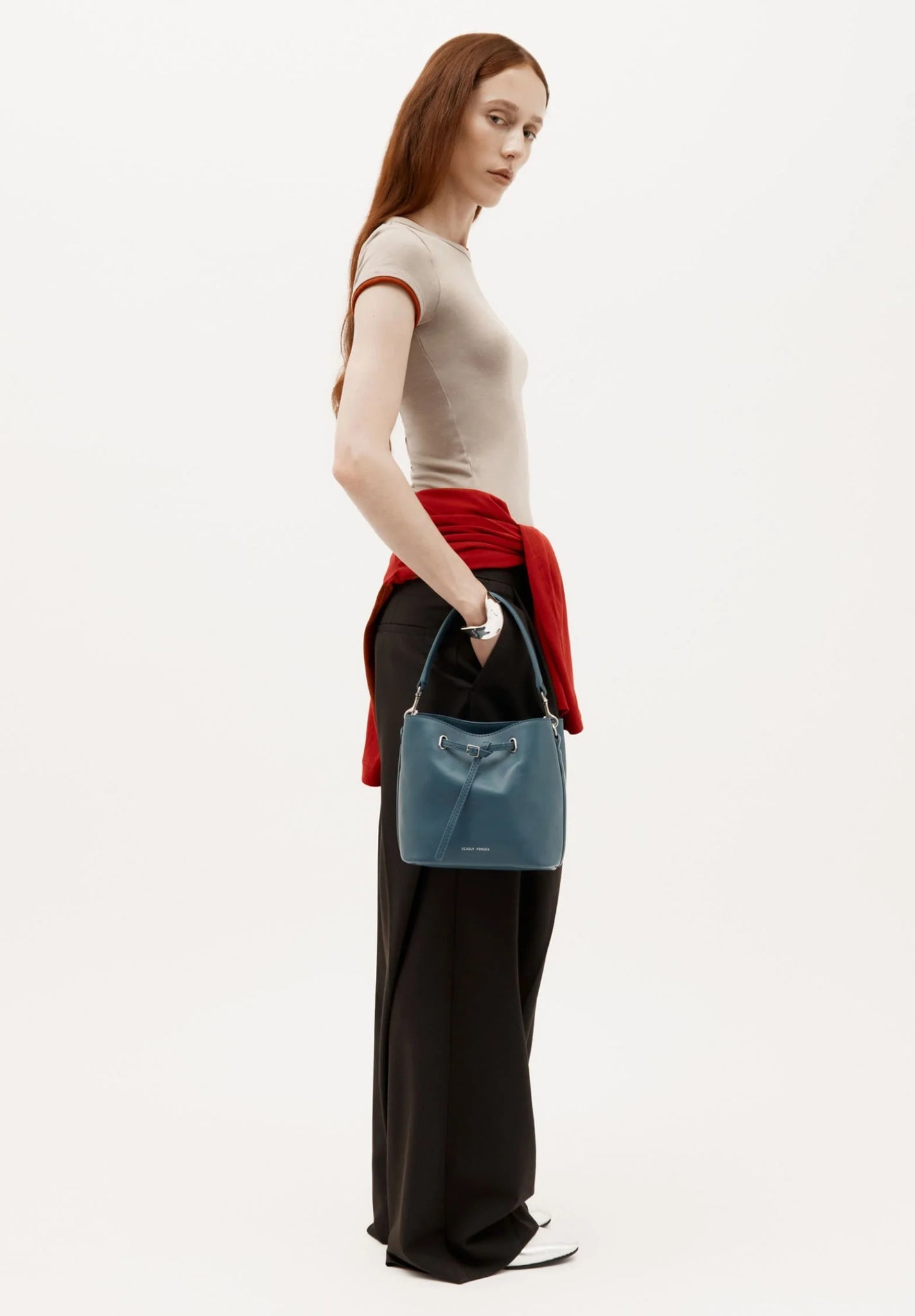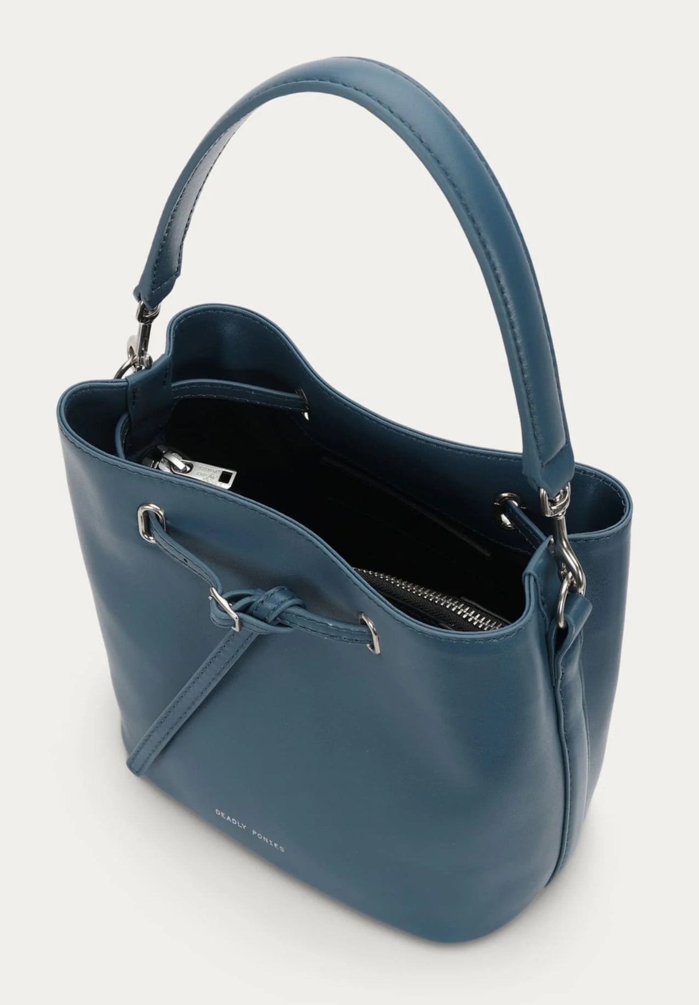 Mr Penny in Dusk reimagines the classic bucket bag in LWG-certified Lamb Nappa with silver finish brass hardware. Featuring leather detailing threaded through silver finish brass eyelets, a detachable top handle, adjustable strap, and a removable cotton pouch.