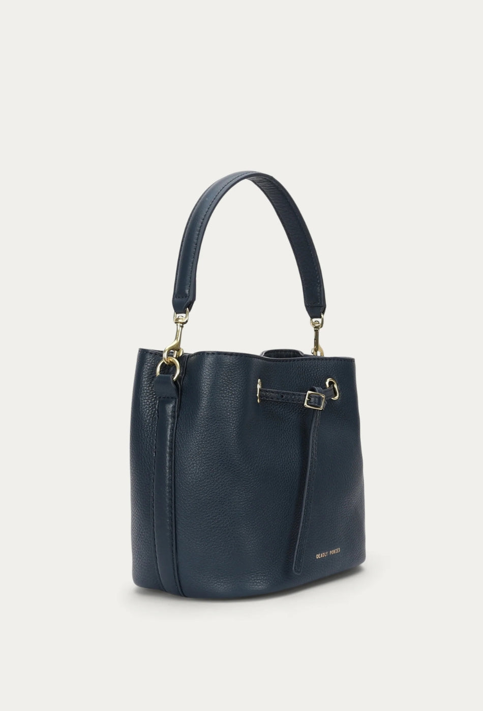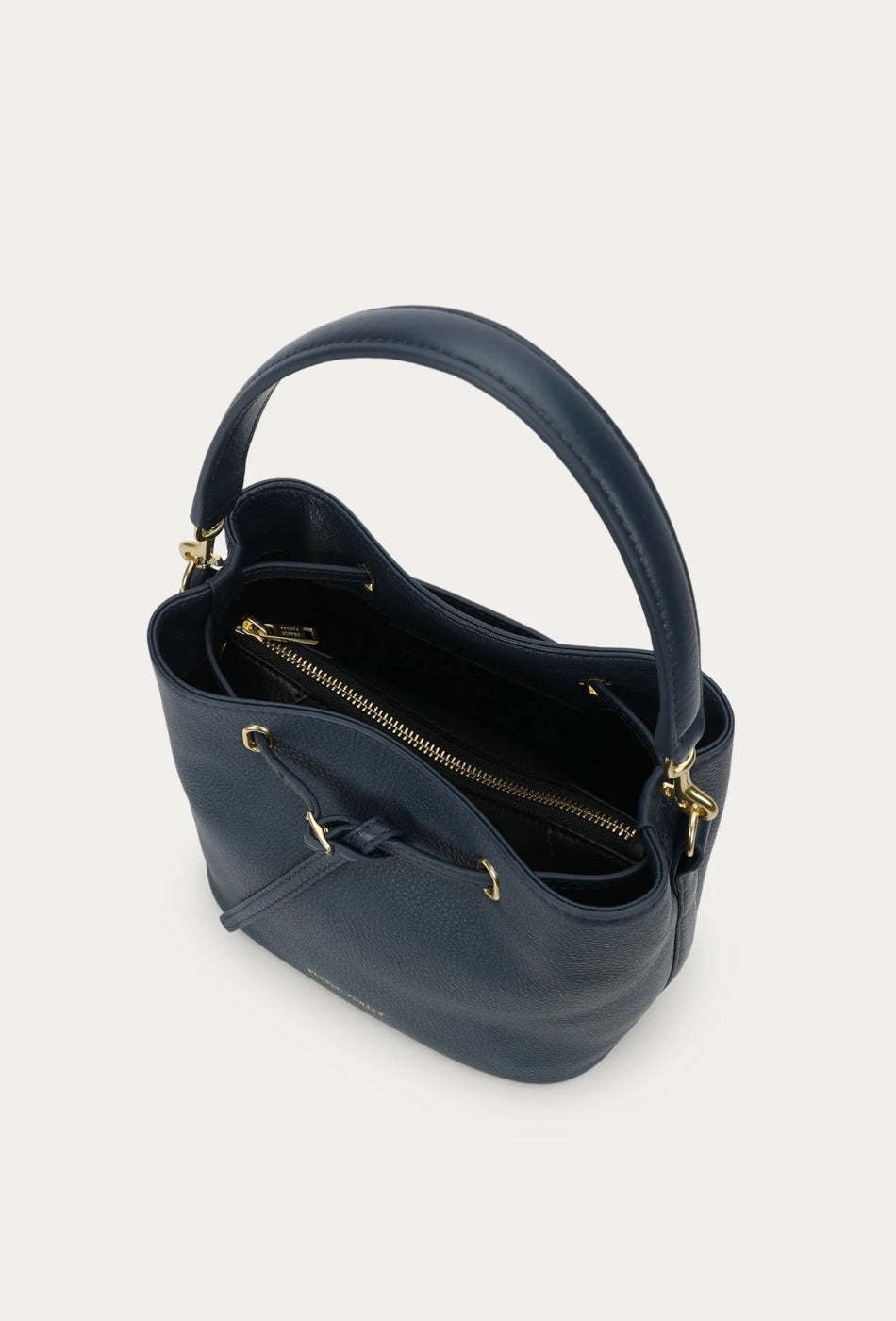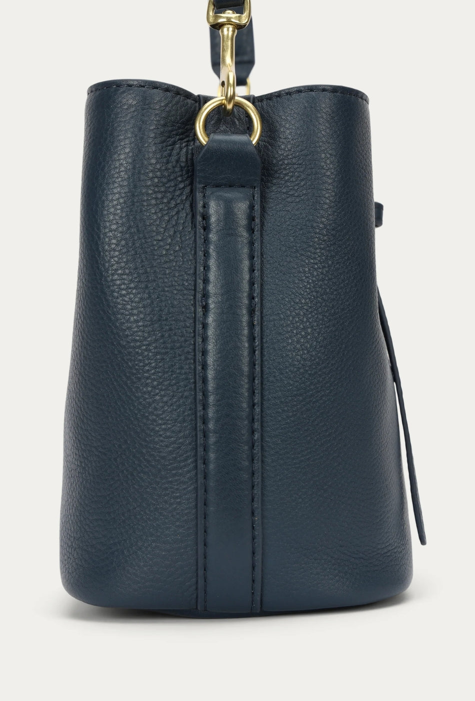 Mr Penny in Ink reimagines the classic bucket bag in supple Calf Nappa, finished with solid brass hardware. He features leather detailing threaded through brass eyelets, a detachable top handle, an adjustable strap, and a removable cotton pouch.