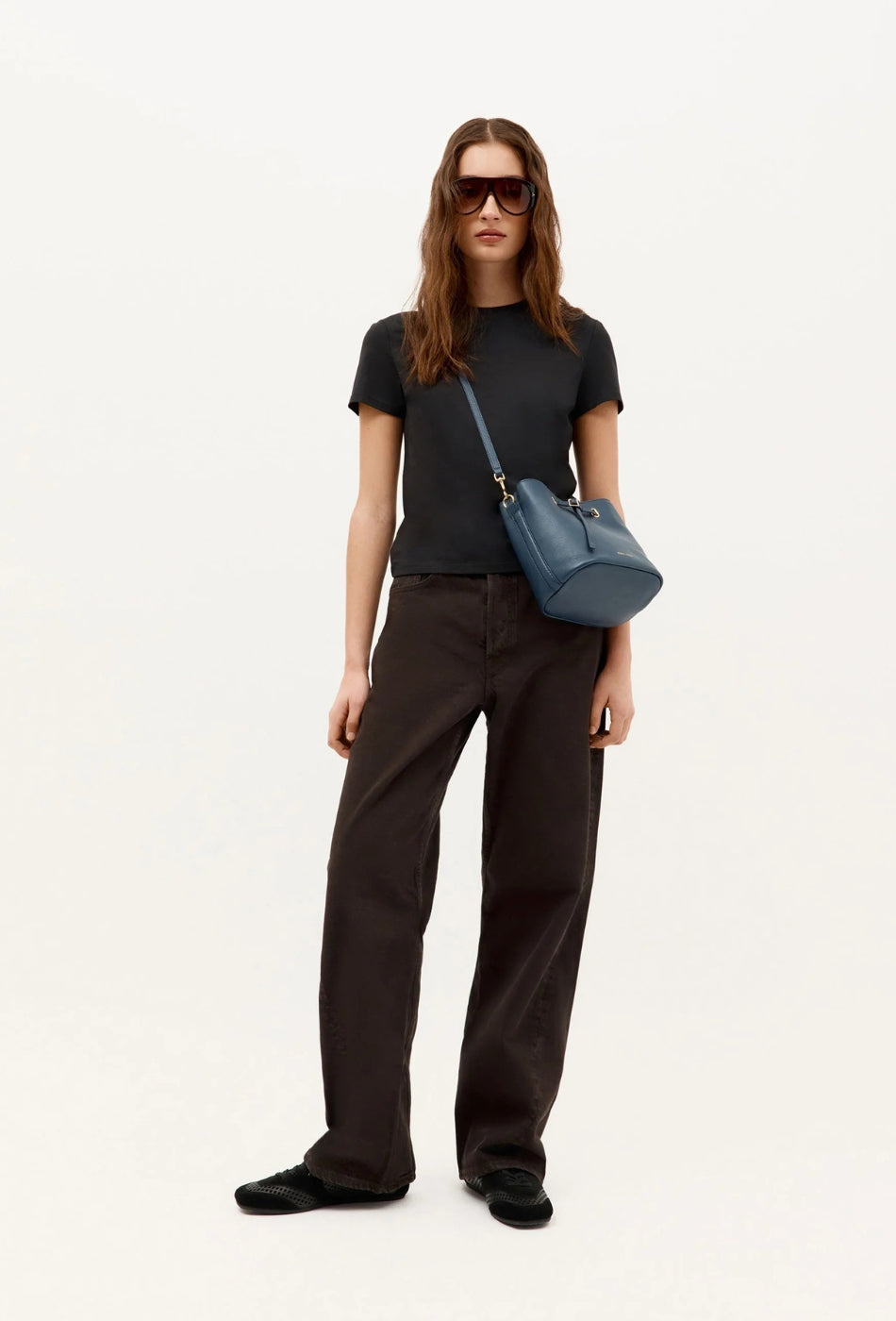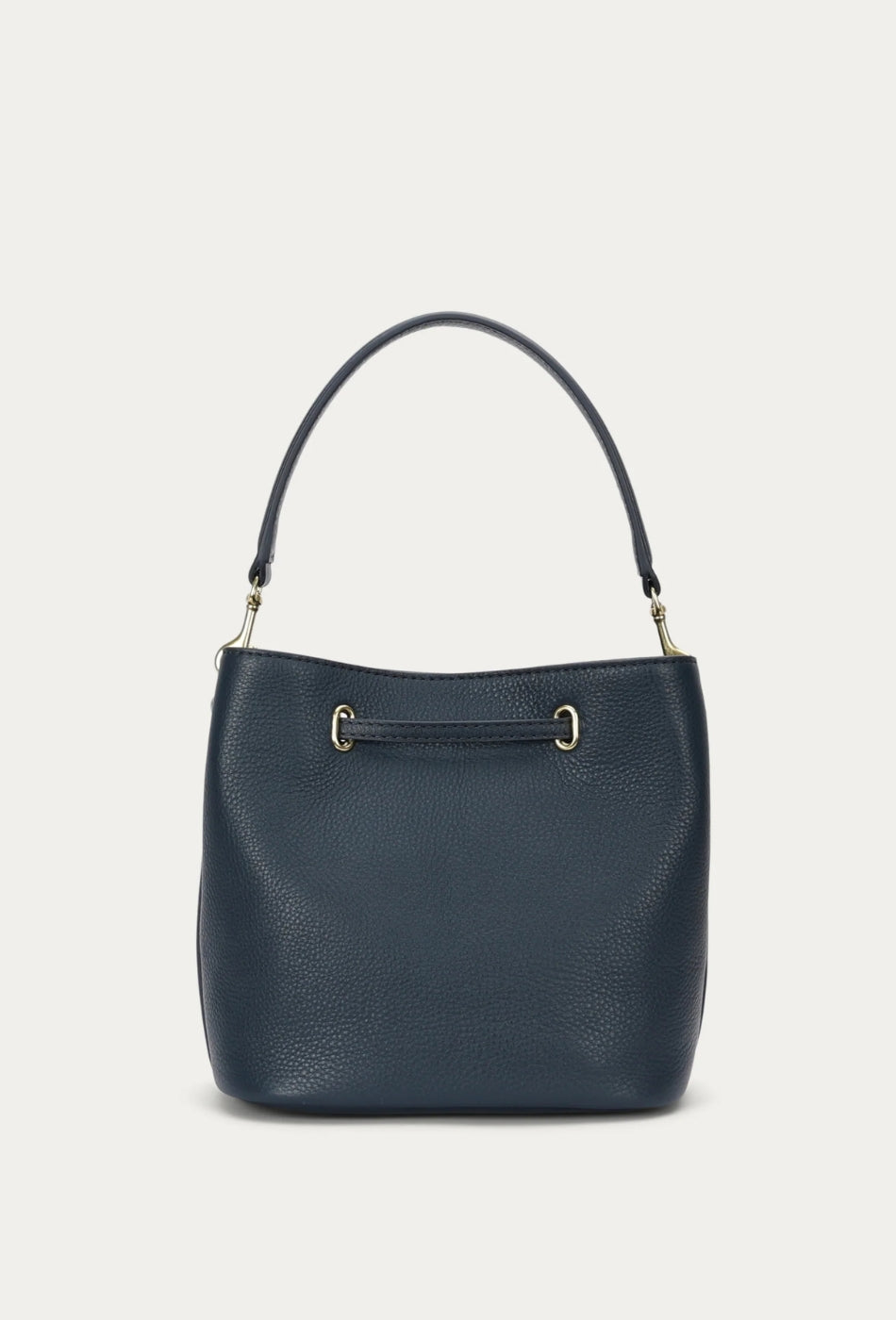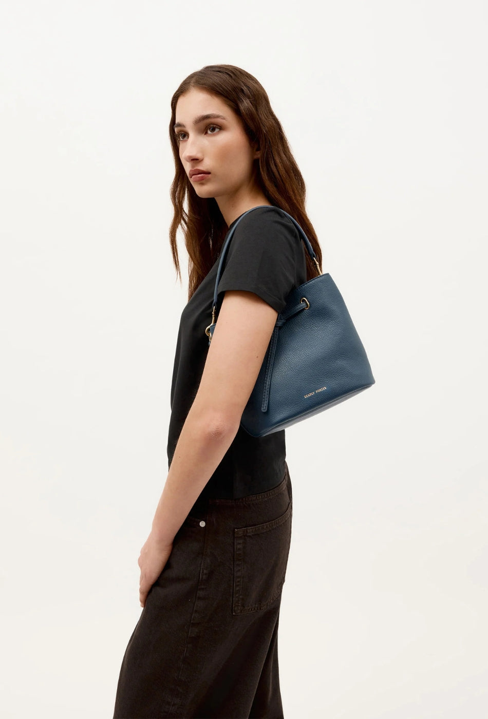 Mr Penny in Ink reimagines the classic bucket bag in supple Calf Nappa, finished with solid brass hardware. He features leather detailing threaded through brass eyelets, a detachable top handle, an adjustable strap, and a removable cotton pouch.