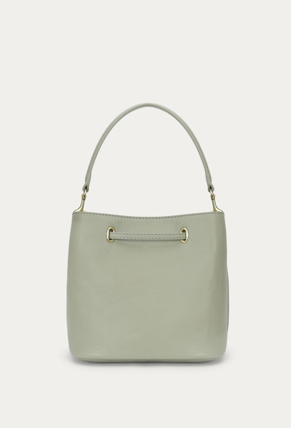 Leather strap detail looping through brass eyelets at top edge.
