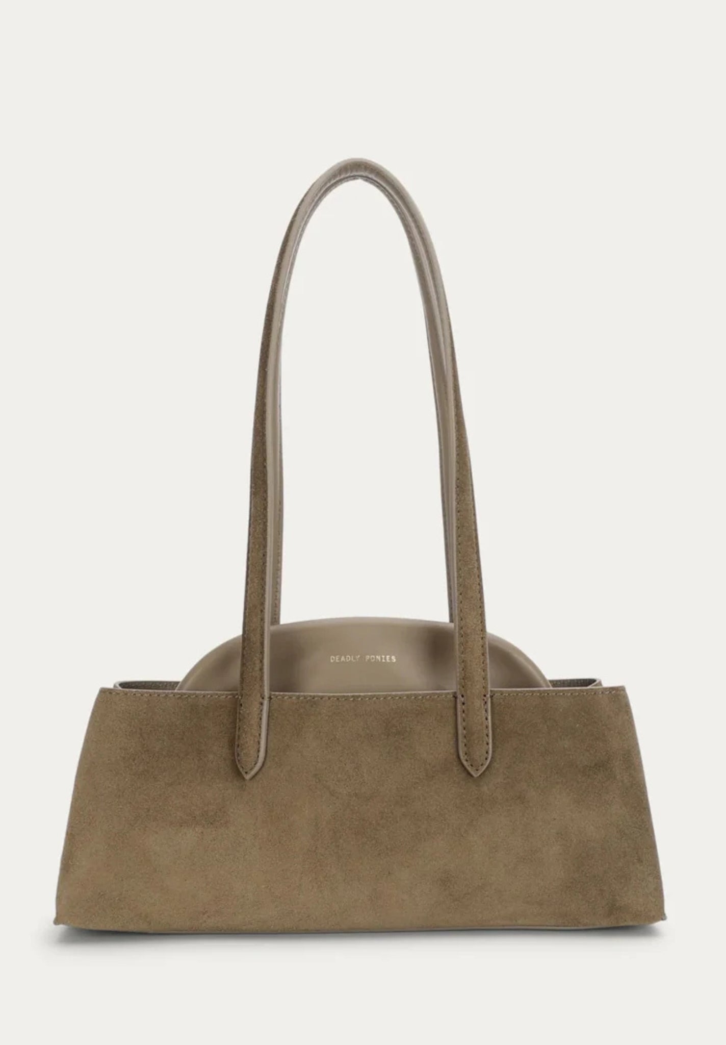 Mr Vault Tote Mini is a compact carry-all, crafted from LWG-certified Calf Suede in Dune. Designed with dual fixed leather top handles and an internal metal frame at the top edge, secured by a magnetic closure. Interior features include front and back slip compartments and an internal slip pocket.