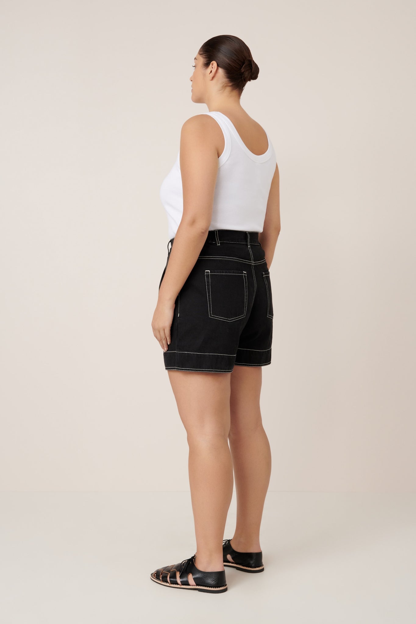A mid-rise denim short that ends just above the knee, featuring an elastic waistband for a comfortable fit and contrast topstitching throughout. The shorts have front pleats, back patch pockets, and are fastened with nickel-free tacks in a concealed front fly.
