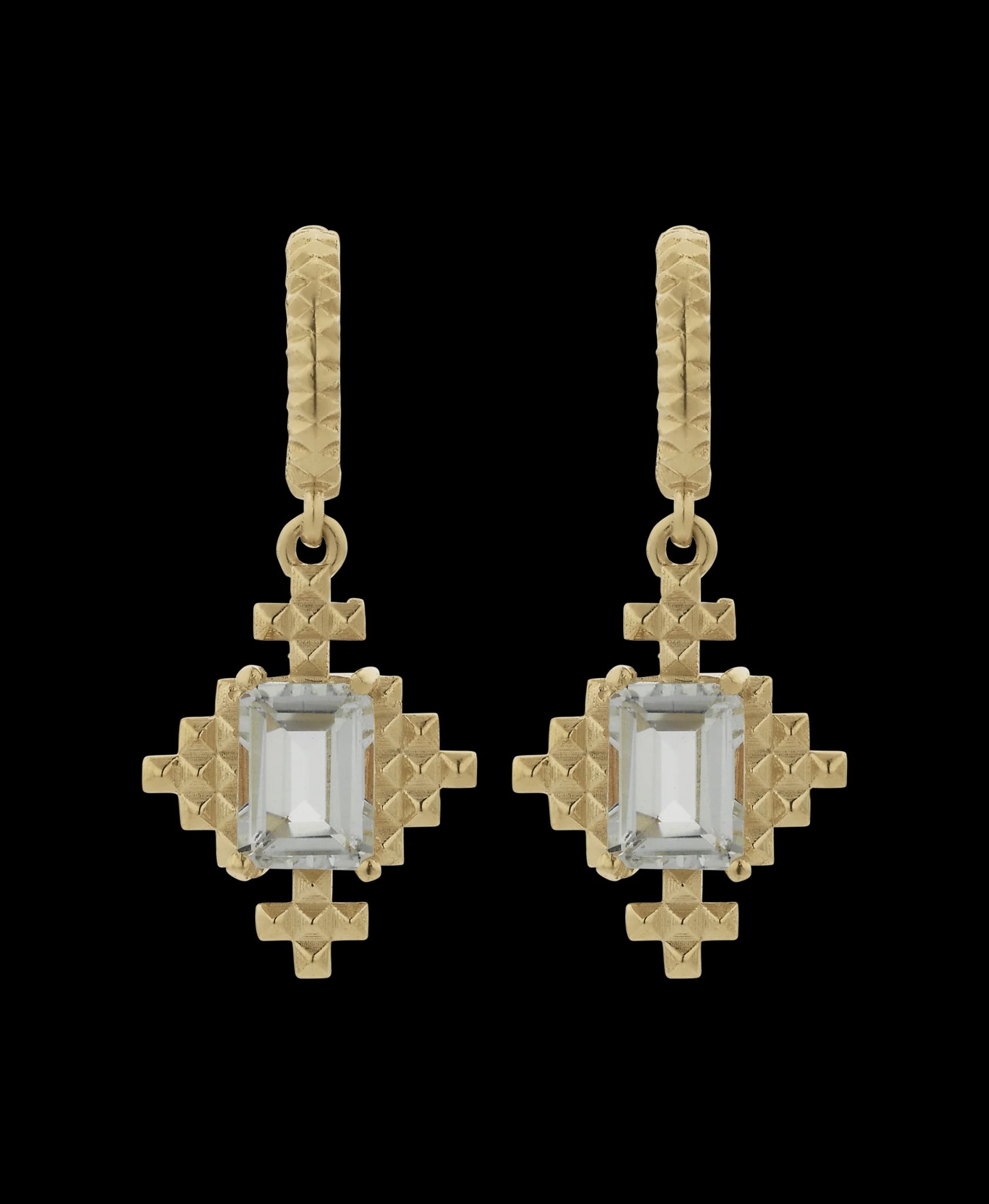The Reya Hoops feature a beautiful baguette-cut White Topaz. This stone is held by a textured hoop that hugs the lobe and swings with soft movements.