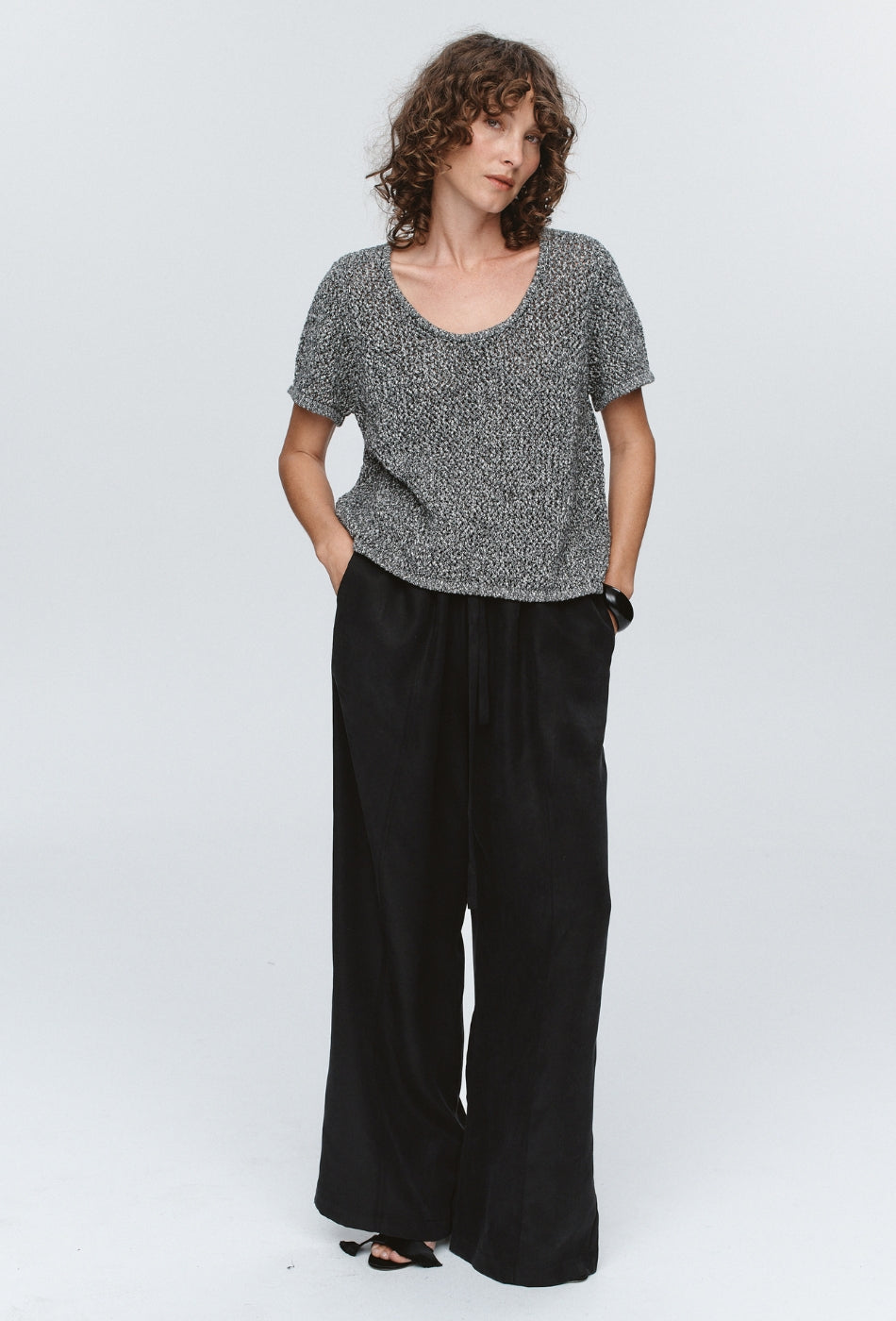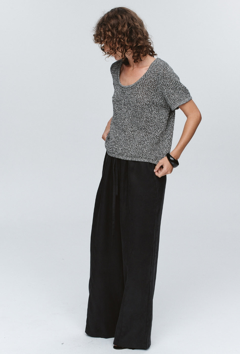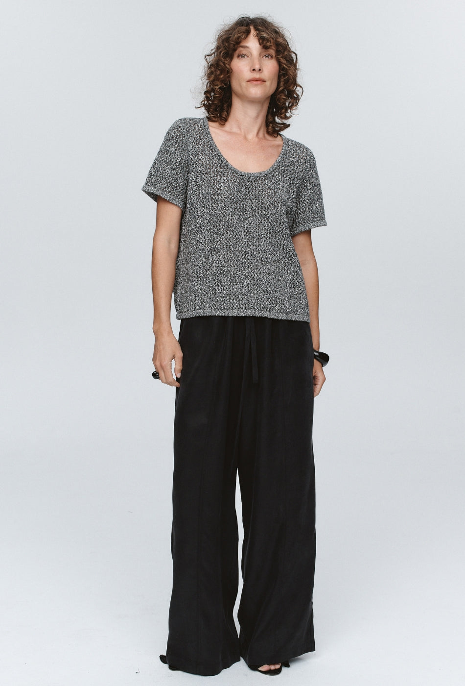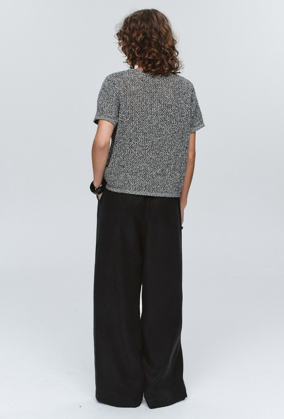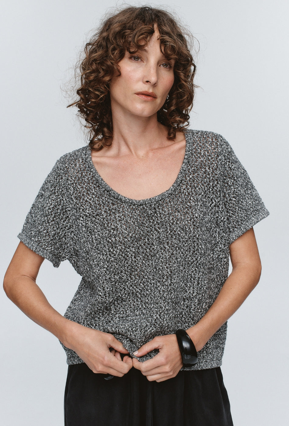 Lightweight short-sleeve top constructed in a 100% cotton, black and ivory mélange yarn. Designed with a relaxed, boxy shape and finished with a wide scoop neckline. Suitable for layering or standalone wear.