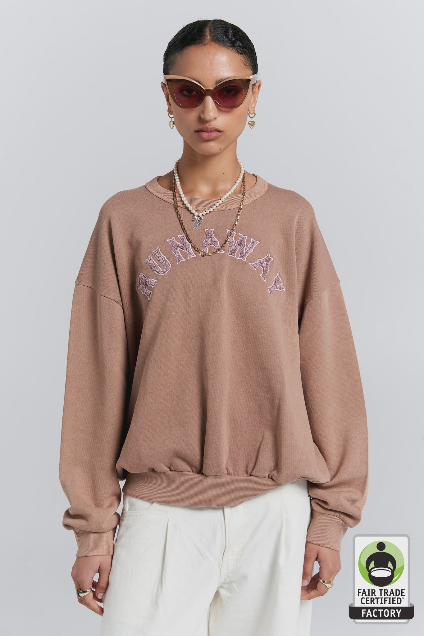 The Runaway College Organic Cotton Crewneck Sweatshirt combines comfort and style in a classic, slouchy silhouette. This slouchy, relaxed fit sweat is embroidered with an arched “Runaway” slogan in a collegiate font, adding a spirited touch to your off-duty looks.