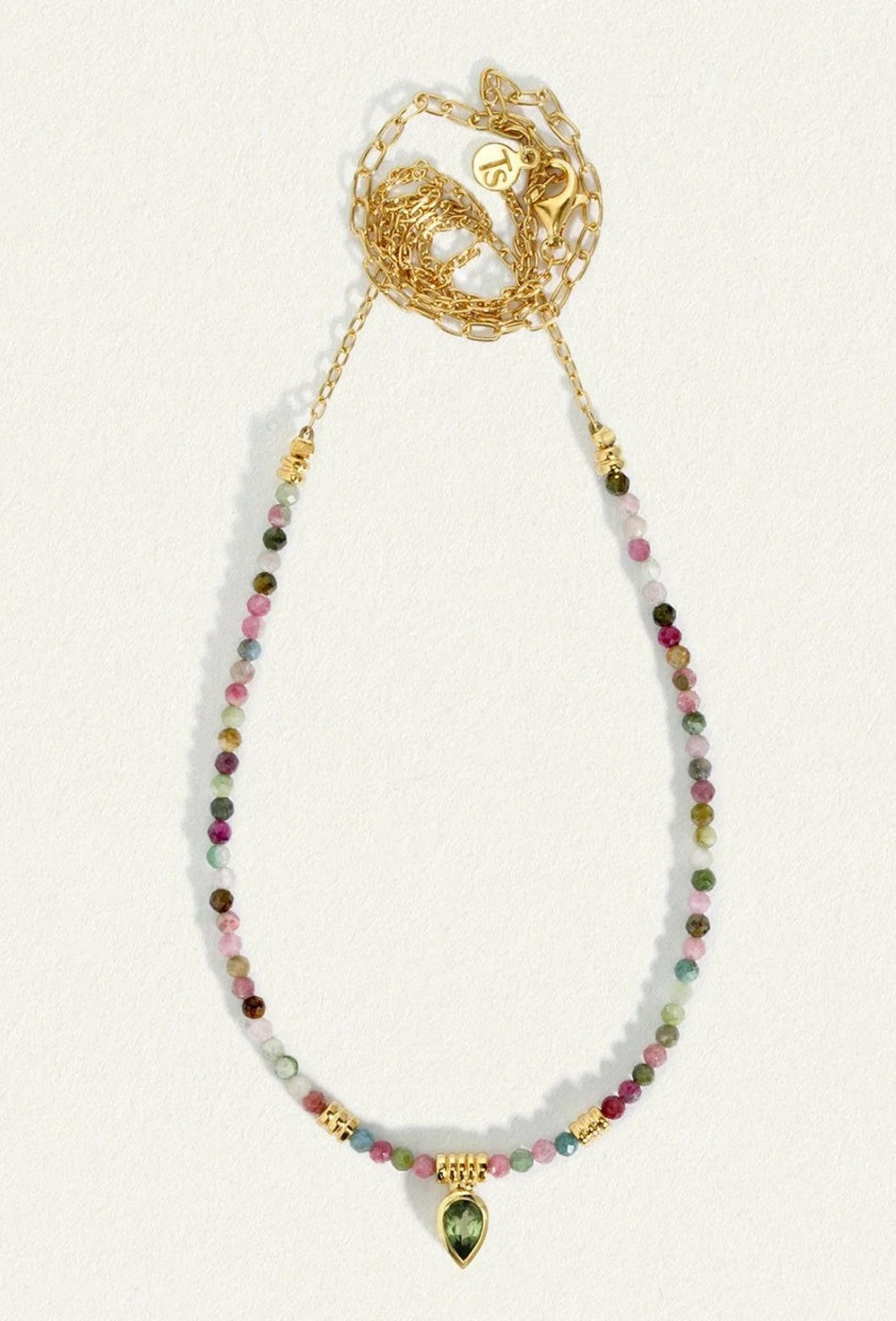 Miraculous and sweet, like the Greek Island itself, this delicate ring of festive tourmaline enrobes the wearer in a playful spirit. The faceted mix of Tourmaline gemstones that are strung upon a cable chain with a dazzling Green Apatite pendant held at its centre, help one harness personal power and achieve one’s goals.