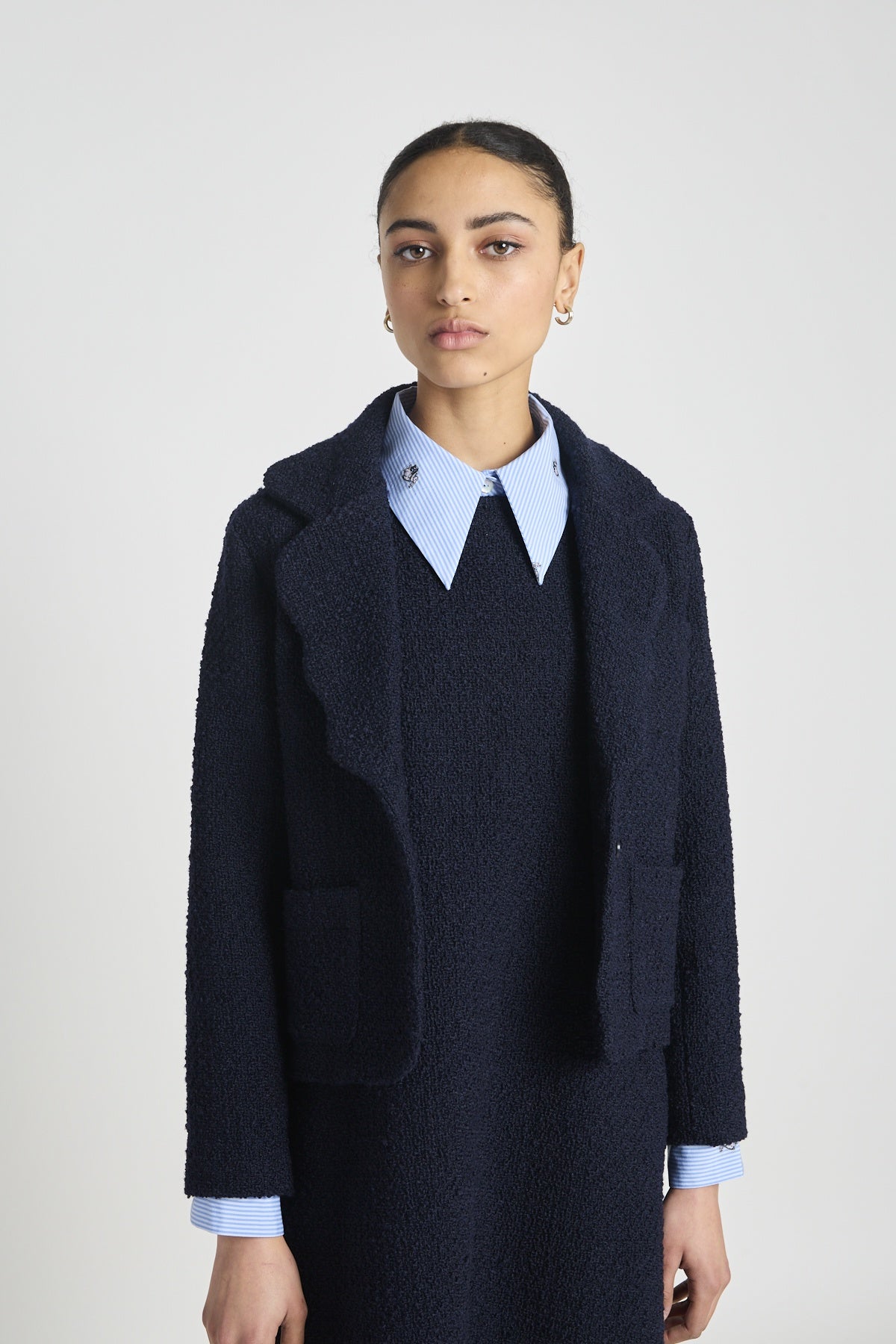 A little good luck charm in navy bouclé, the Theory blazer brings back our beloved scalloped collar, and has three patch pockets and a double button closure.