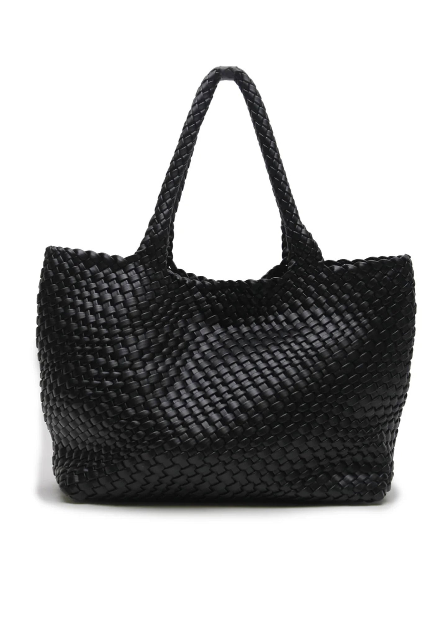 The Woven Tote is a practical staple. Handwoven from 100% vegan leather, it is a versatile option for everyday use. Features include a magnetic closure button and canvas insert.